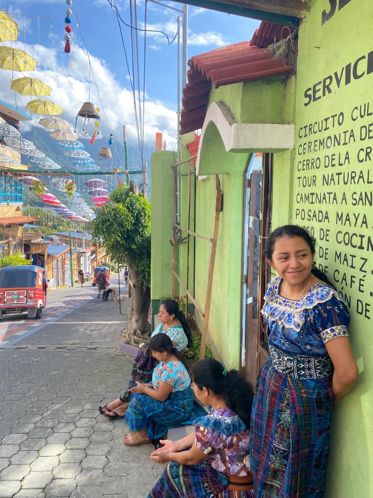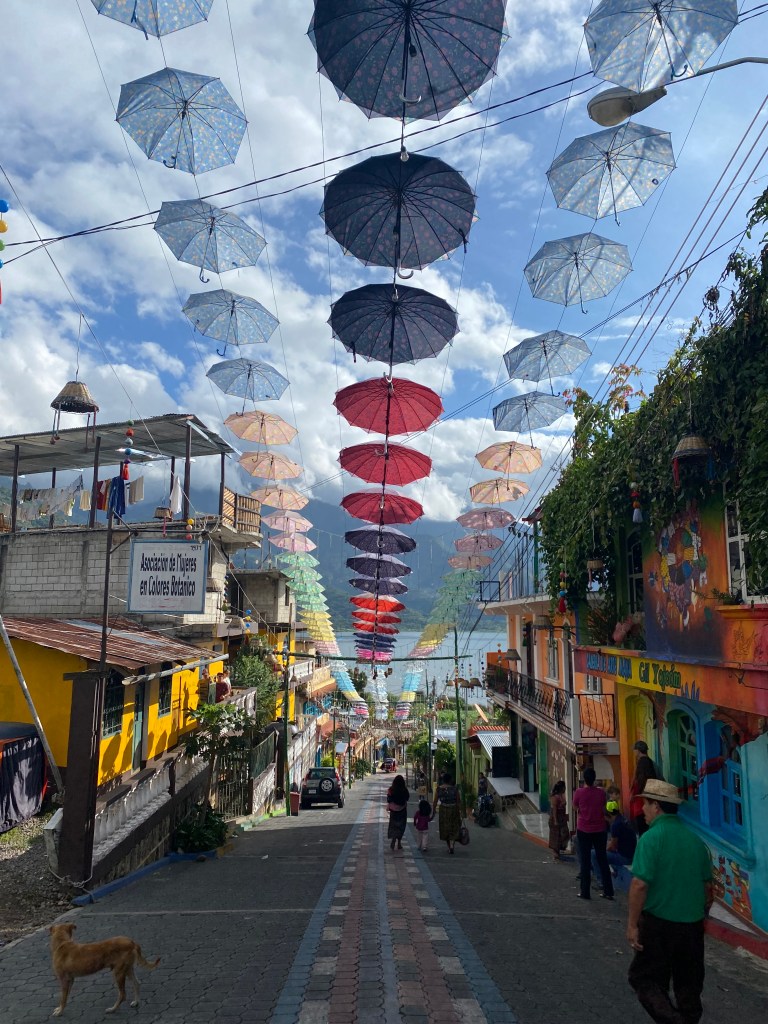 Lake Atitlán is the deepest lake, (approx. 300m deep), in Central America and is nestled between 3 volcanos. Around the lake there are 12 towns and the first one we visited was Panajachel. It seemed like a place that was very much geared towards tourists. There were market stalls with a lot of somewhat tacky souvenirs, touristy knick-knacks and traveller appealing activities. We arrived quite late so immediately headed off for dinner and drinks. I made everyone go to this bar, Simoneta Mixology Cantina, that I had found on Insta. We arrived and immediately we all agreed that this was the coolest bar we’d been to. It has the feeling of a ruin bar in Budapest, with low lighting and writing all over the walls. The barman asked us all what type of drinks we liked and made us each a cocktail based on our answers. The music was blaring, the barman was doing up magic with the cocktails, we left our mark on the wall and tried cusha – the vibes were truly immaculate.