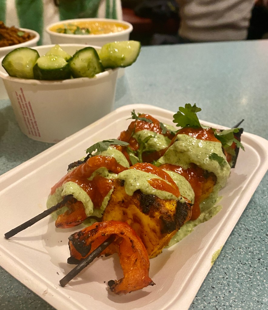 Everything on the menu is vegetarian and most of the options are either already vegan too or can be made so. We ordered the ‘combo for 2’, (which will easily feed 3!), which has smacked khakri; sprout bhajis; bundo chaat; festive dhal & rice; chole saag and – my absolute favourite – paneer tikka. Let’s be real, paneer is a winner in its own, but the smokey barbecue flavour with the red pepper ketchup & spinach chutney really makes this a true champion. This dish literally makes me like mushrooms, (and I hate mushrooms!).
