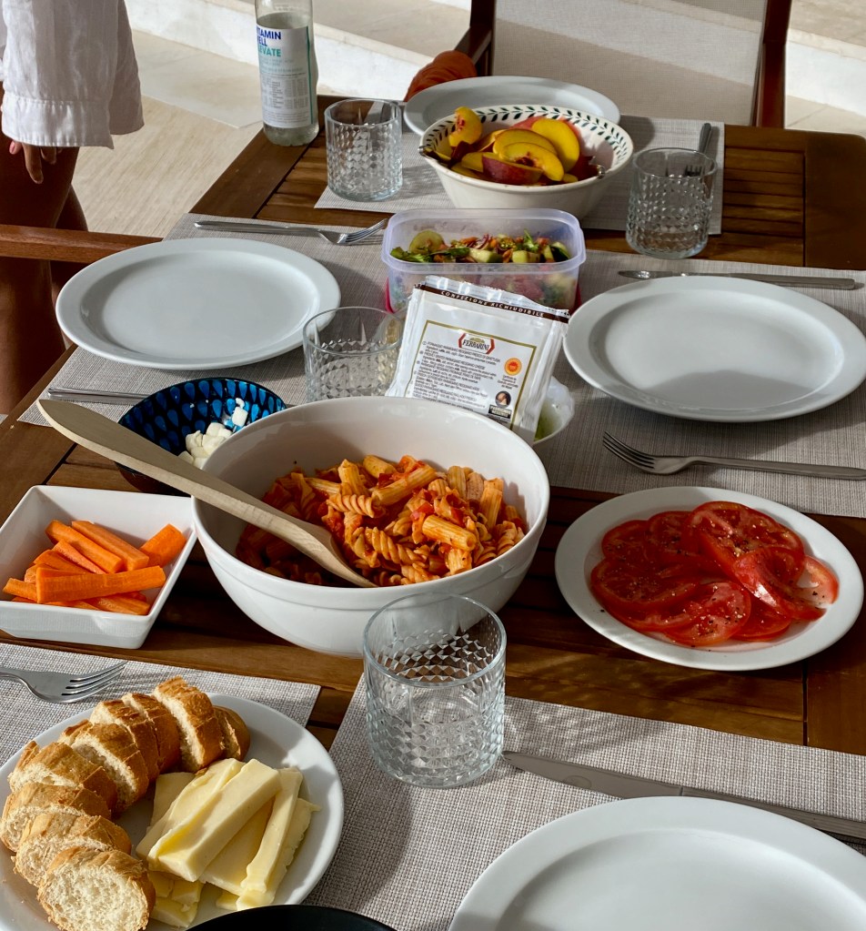 Our days consisted of waiting for the clouds and rain to clear, (the weather tried very hard to spoil our fun), before lying by the pool in the sun. Lunches were a classic ‘girl dinner’ – think a mismatch of pasta, cheese, bread and the superior fruit and veg you get in Europe, drowned in olive oil. We played games, chatted about all sorts, and attempted to catch golden hour every evening.
