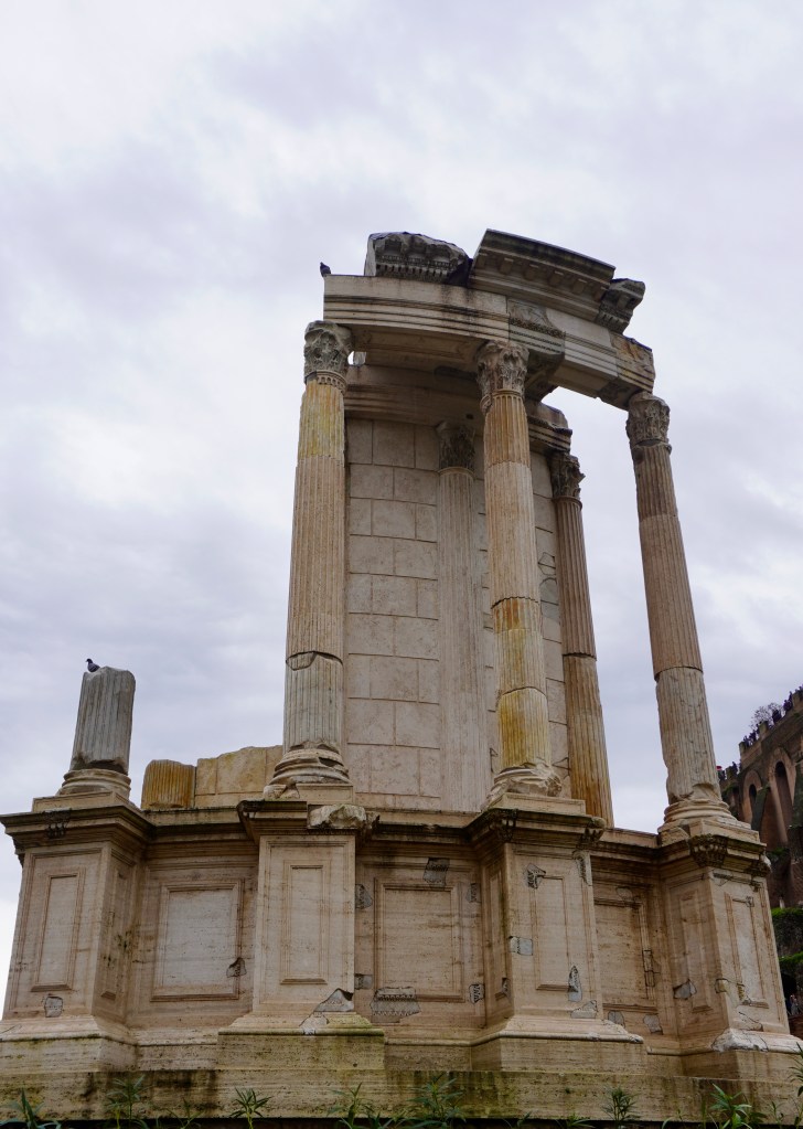 It was genuinely wild to walk around and take in the ruins of what used to be a bustling hub of activity. Every so often, our tour guide Diana would show us recreations of what it would have looked like. There are arches from basilica’s, (which were like business centre’s back then), to homes of emperors and temples: like The Temple of Vesta. There was a fire that was thought to have been sent by the Gods and therefore needed to be tended to. Six girls from rich families were offered up to ensure the fire was kept alive. They were obviously virgins so not to contaminate the sacred fire, they were not allowed to have contact with anyone from outside and if they broke any of these rules, they’d be cast out to a room outside of Rome and left to die. They weren’t literally killed as they were seen as sacred women who emperors would go to advice, but it’s still a pretty grim way to die.